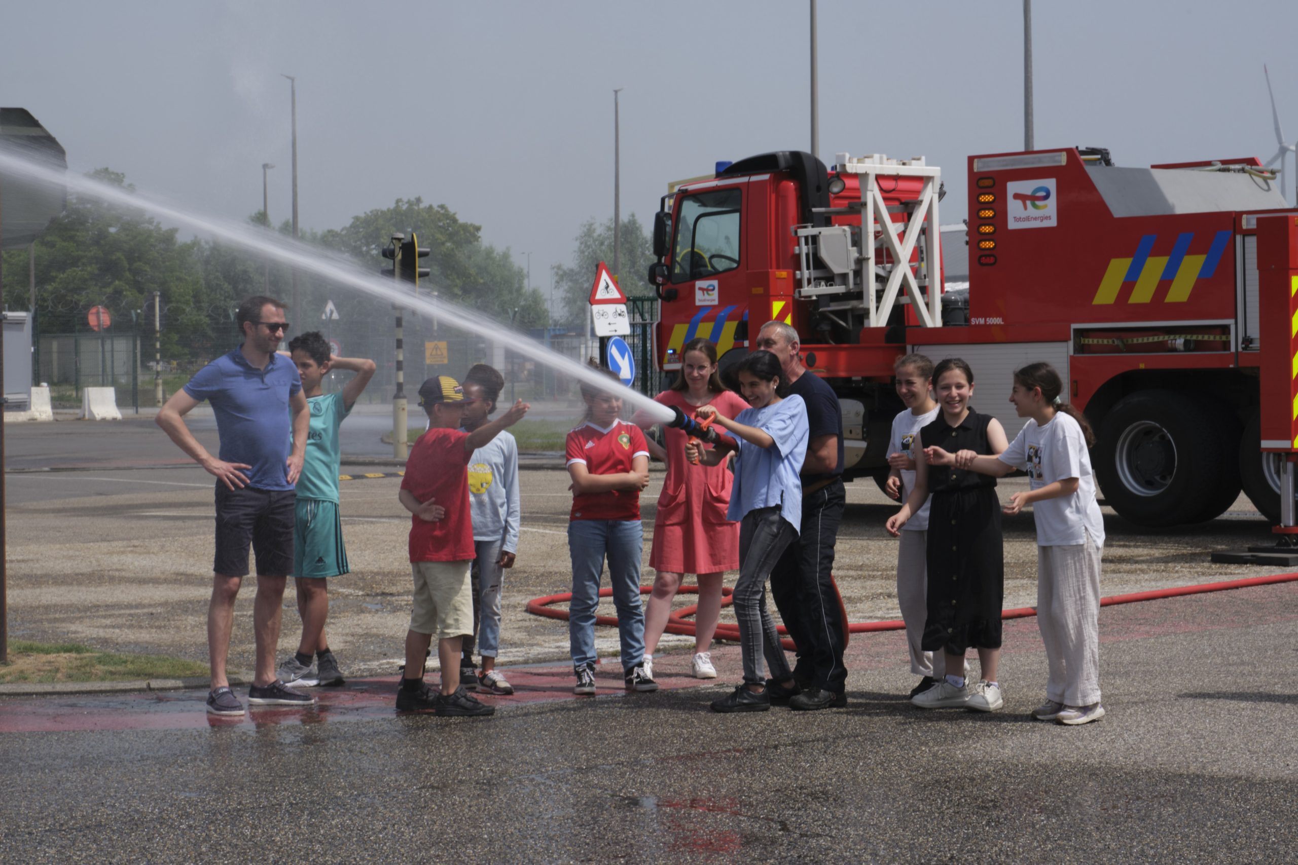 Opnieuw mocht een groep jongeren uit het Brusselse de raffinaderij van Total bezoeken. De brandweer maakte er een spektakel van met veel waterplezier op een dag waar de temperaturen naar de 35 graden klommen. Elk bezoekertje kreeg een supergrote foto mee naar huis.